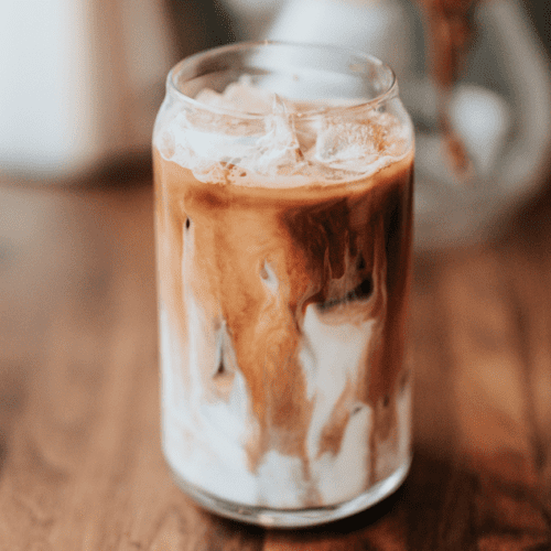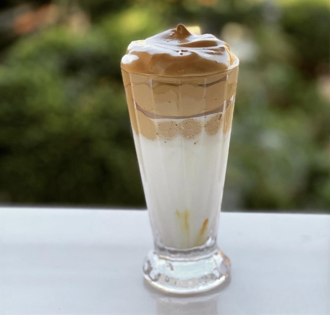 2 shoturi de espresso-40ml, zahăr-8g, cuburi de gheață, lapte rece-100ml, frișcă