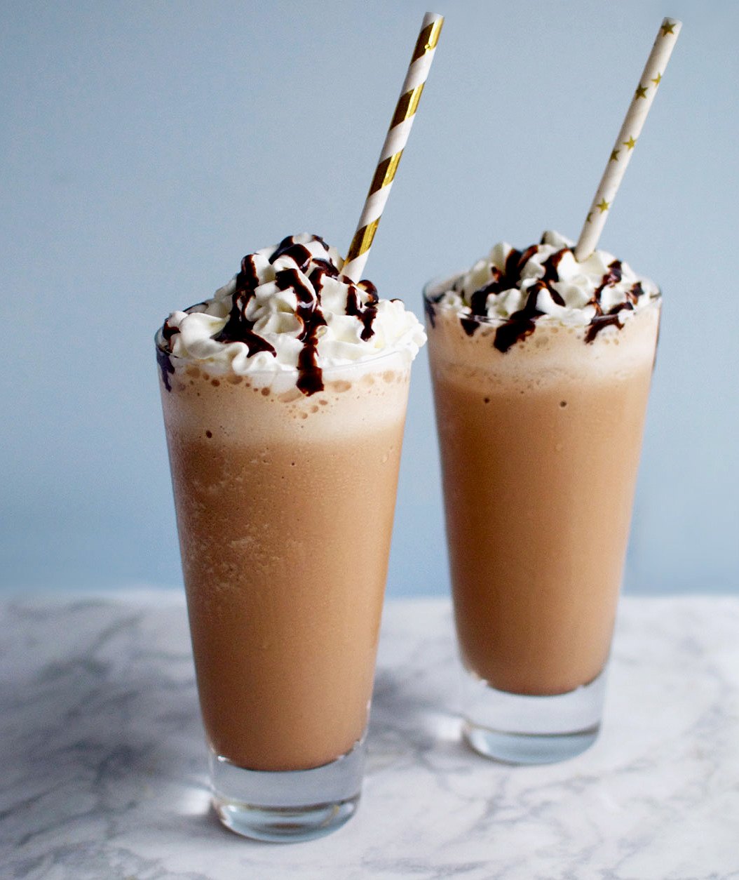 2 shoturi de espresso-40ml, zahăr-8g, cuburi de gheață, lapte rece-100ml, frișcă, înghețată-80ml